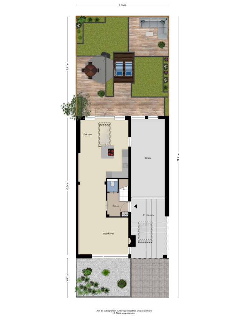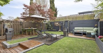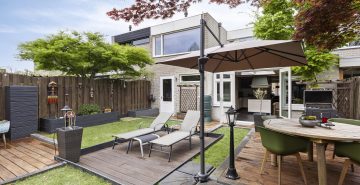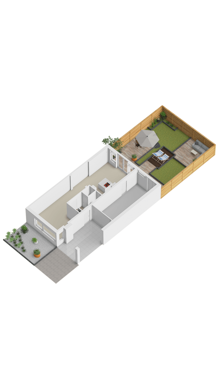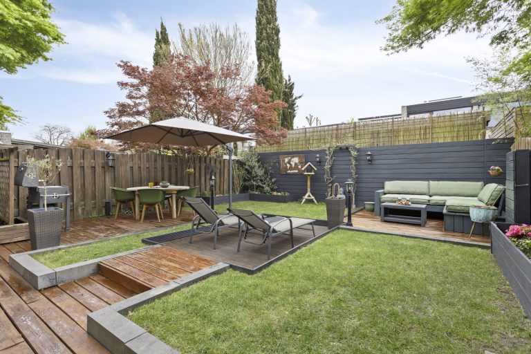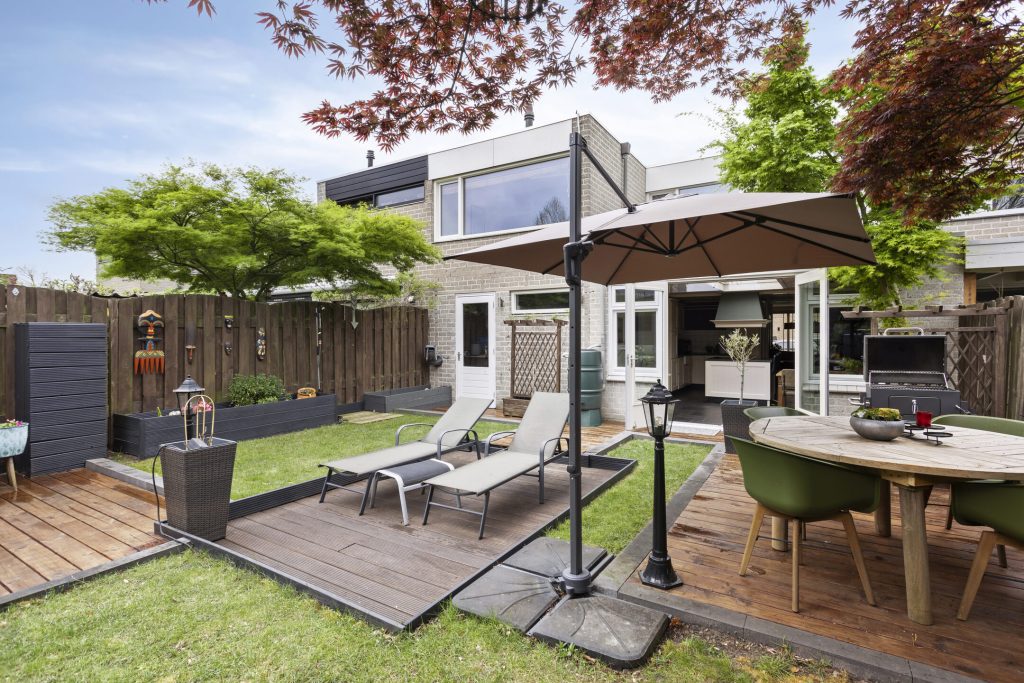 – De tuin is voorzien van meerdere zonneterrassen, gazon en plantenborders