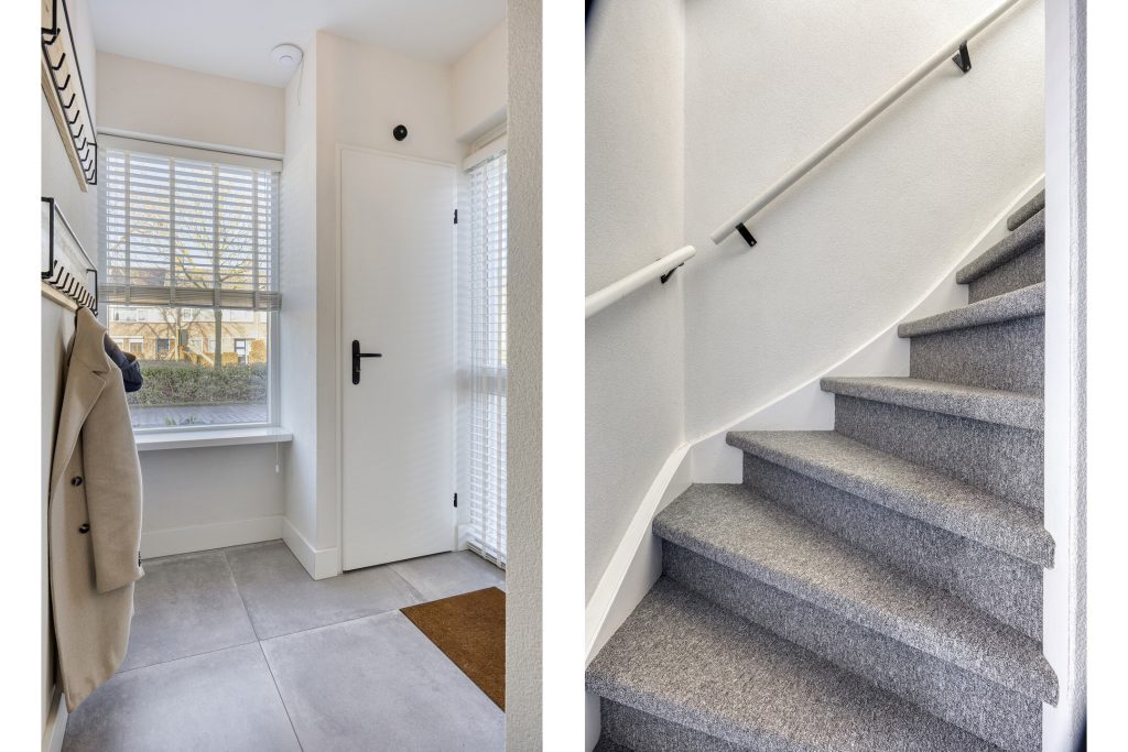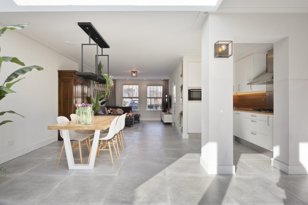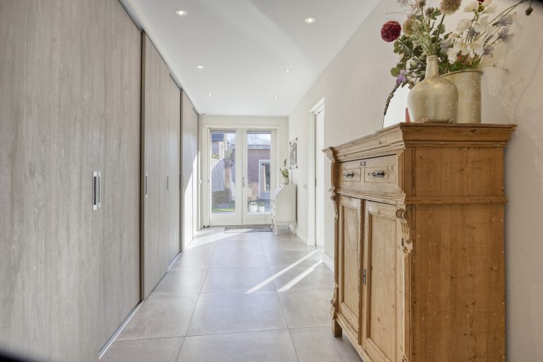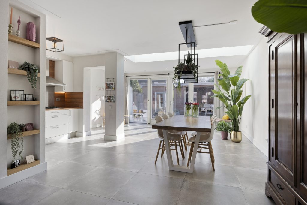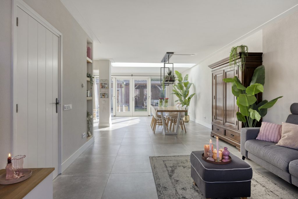 Via de voordeur kom je binnen in de hal, waar zich het toilet, de trapopgang en de meterkast bevinden. Vanuit de hal is er toegang tot de woonkamer en de overige ruimtes van de woning. De ruime en lichte woonkamer staat in open verbinding met de keuken. In de keuken geniet je van veel natuurlijk daglicht dankzij de fraaie lichtstraat en de grote raampartijen aan de achterzijde van de woning. Hierdoor is er een prettige verbinding tussen binnen en buiten ontstaan. De keuken is uitgerust met een combimagnetron, koelkast, 4-pits gaskookplaat, afzuigkap en vaatwasser. De gehele begane grond is voorzien van comfortabele vloerverwarming. Aansluitend aan de woning bevindt zich een royale multifunctionele ruimte, die tijdens de verbouwing in 2017 is gerealiseerd in de voormalige garage. Deze ruimte is voorzien van openslaande deuren naar zowel de oprit als de tuin en is uitstekend te gebruiken als werkruimte, speelkamer, hobbyruimte of extra entree. Daarnaast beschikt deze ruimte over een grote vaste kastenwand en de verdeler van de vloerverwarming.