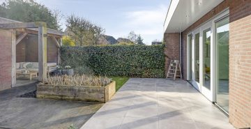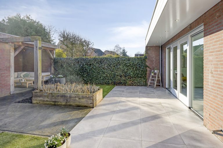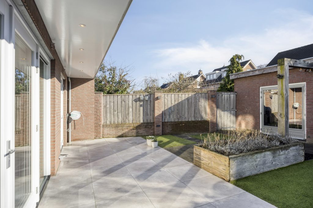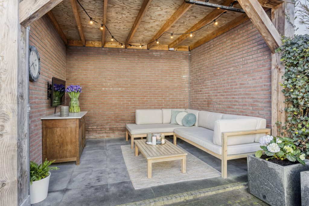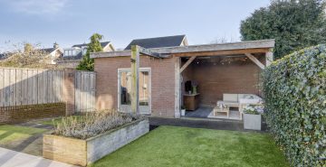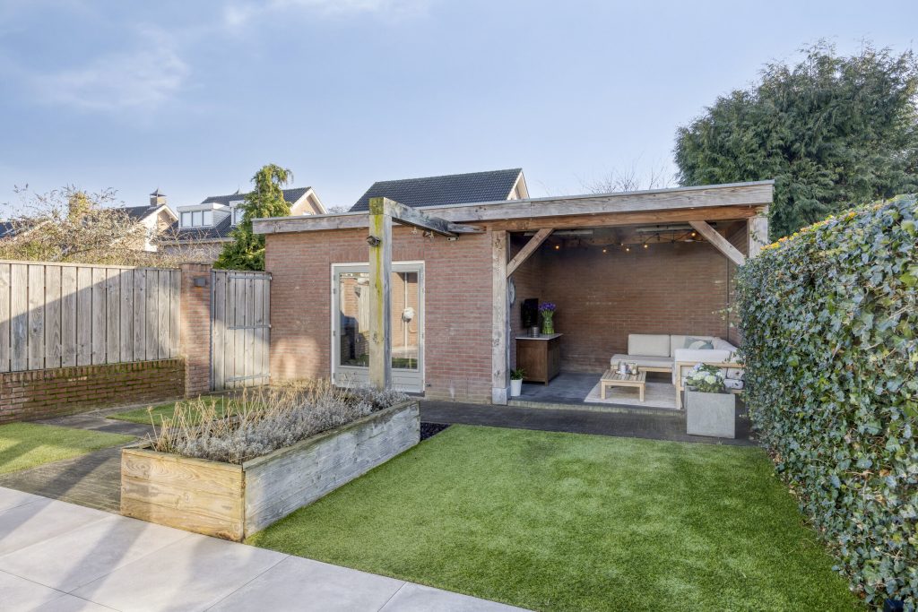 Ook beschikt de woning over een fraai aangelegde tuin die zich uitstrekt aan de achter- en zijkant van het huis. De tuin loopt speels schuin en biedt volop privacy en ruimte. Achter in de tuin staat een vrijstaande stenen berging met een aangebouwde overkapping waaronder een terras is gecreëerd. Deze overkapping is voorzien van tv-aansluiting, internet en heaters, waardoor het hier het hele jaar door comfortabel verblijven is. Ook is er een buitenkraan aanwezig.