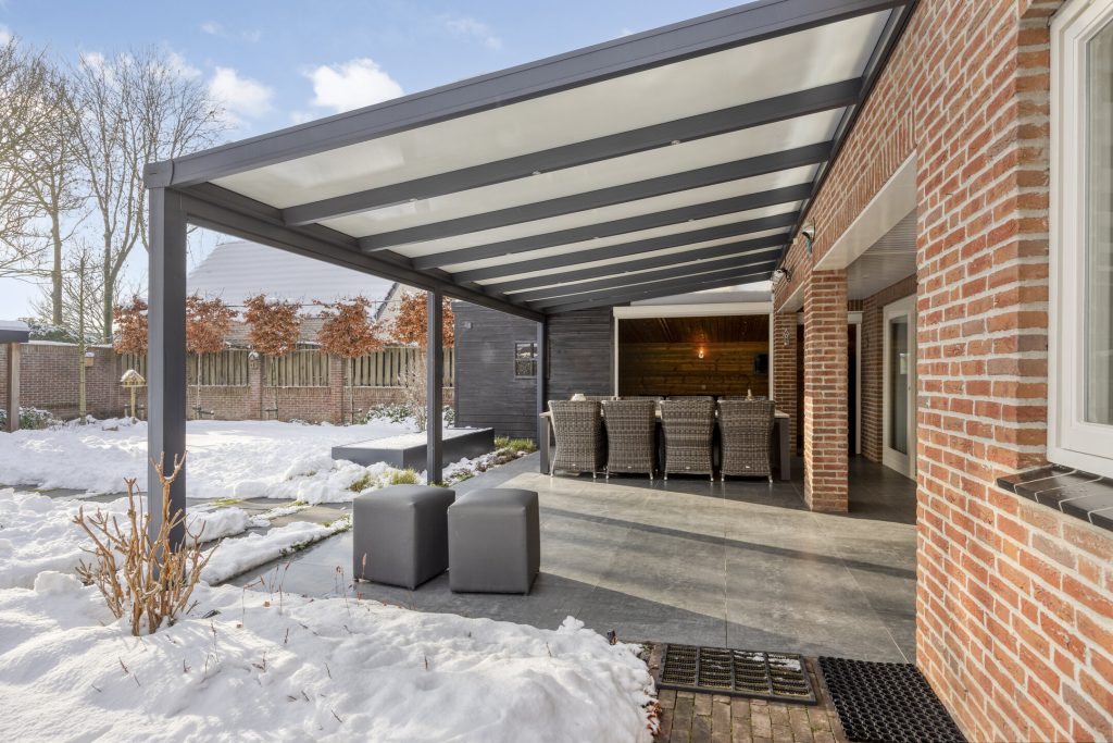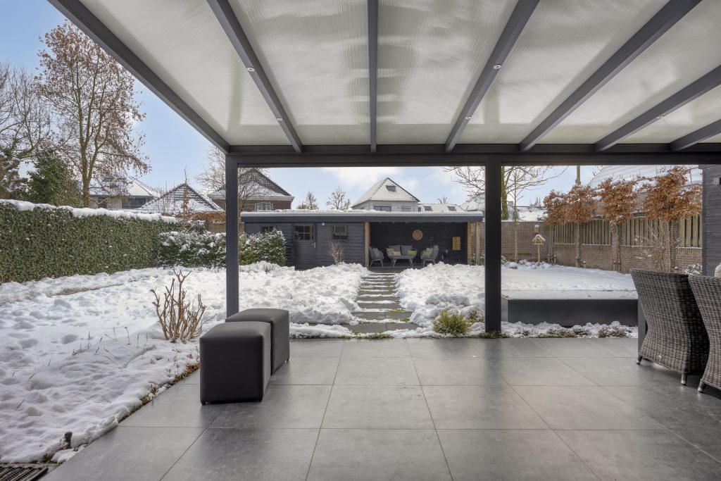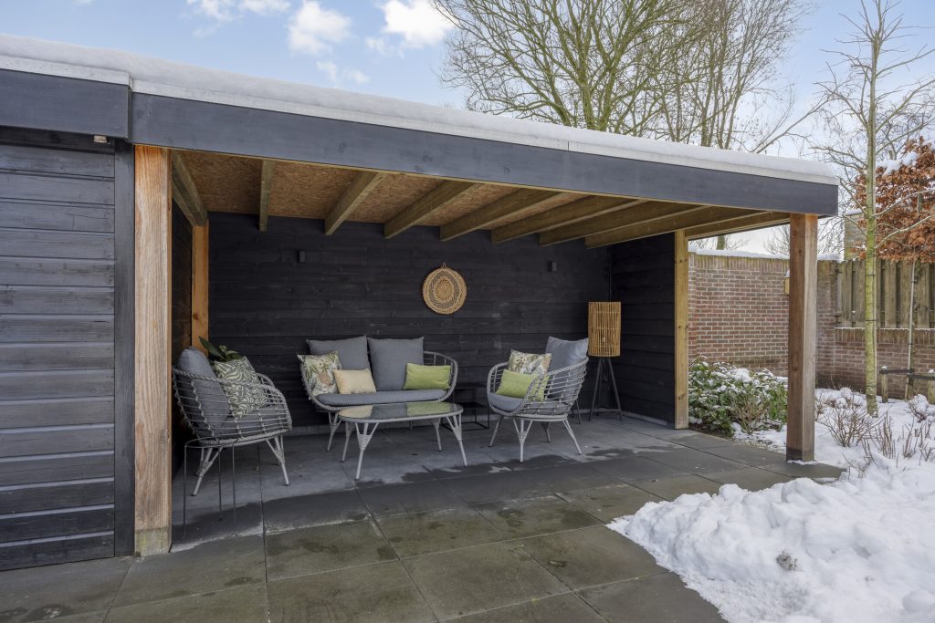 Buiten biedt de woning eveneens veel comfort en plezier. De overkapping verbouwd in 2019, is voorzien van elektrische screens, en biedt een fijne plek om te relaxen, te eten of te genieten van het uitzicht op de tuin. De fraai aangelegde achtertuin, op het zuiden gelegen en vernieuwd in 2022, is volledig afgescheiden, biedt veel privacy en beschikt over een gazon, meerdere terrassen en een achterom. De poort is eveneens vernieuwd in 2022. Dankzij de ideale zonligging is dit een plek waar je vrijwel de hele dag van licht en warmte kunt genieten.
