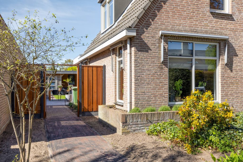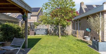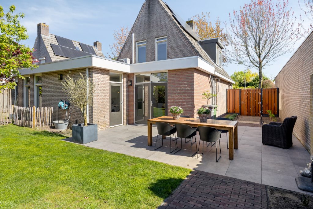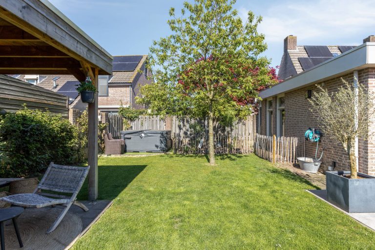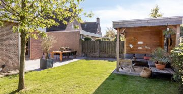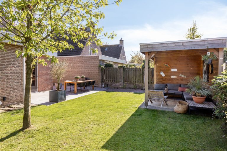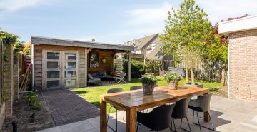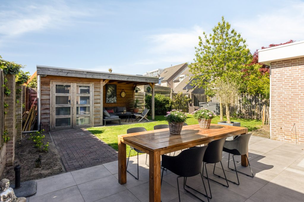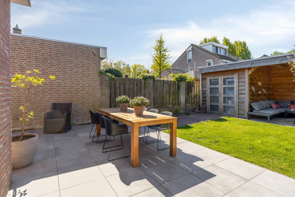 Ook buiten is het geheel met zorg aangelegd. De tuin, gelegen aan de zij- en achterzijde van de woning, biedt een fijne combinatie van gazon en terrassen, waardoor er altijd een plek is in de zon of juist in de schaduw. De overkapping (geplaatst in 2021) vormt een fijne beschutte plek om buiten te zitten. Daarnaast beschikt de tuin over een houten berging, een buitenkraan en een afsluitbare achterom.
