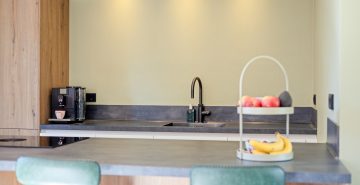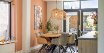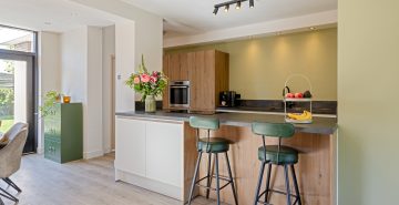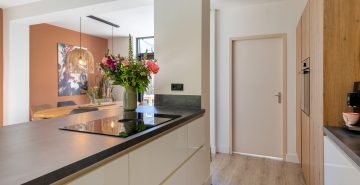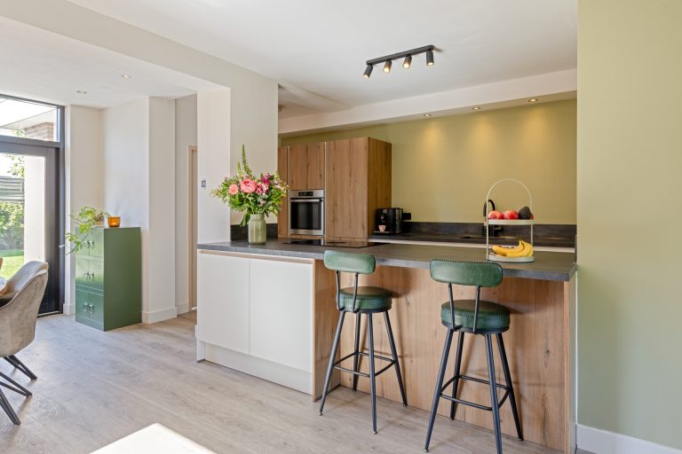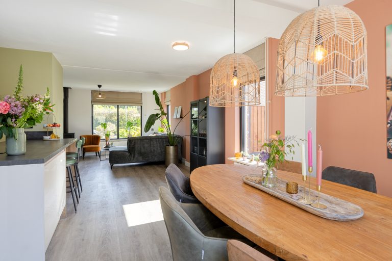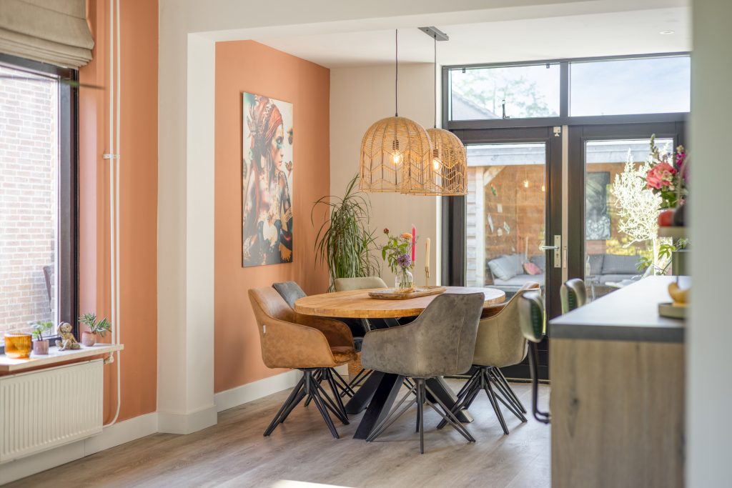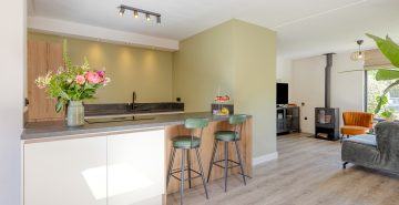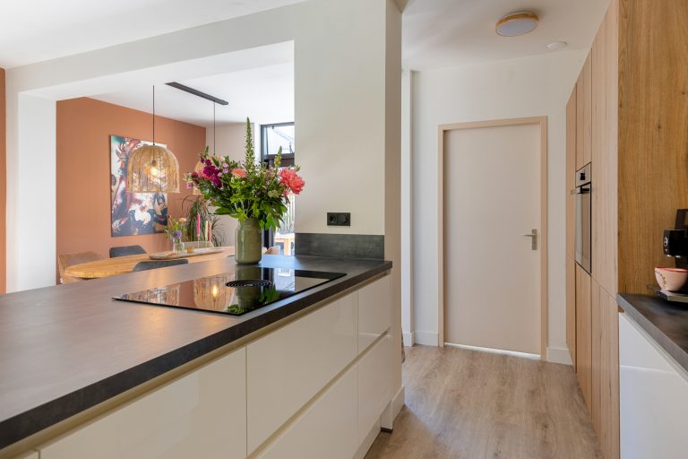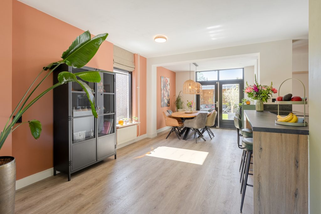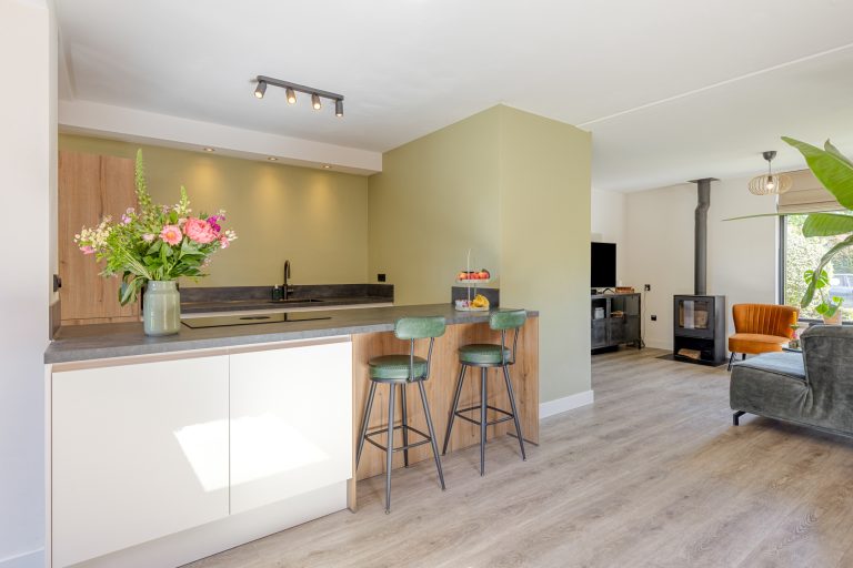 De woonkamer vormt samen met de eetkamer en open keuken één royale leefruimte. De L-vormige opzet zorgt voor een speelse indeling, terwijl de houtkachel juist warmte en sfeer toevoegt. Grote raampartijen en openslaande tuindeuren in de eetkamer zorgen voor een prachtige lichtinval en een directe verbinding met de tuin. De moderne keuken met kookeiland (2025) is een echte blikvanger en uitgerust met hoogwaardige inbouwapparatuur, waaronder een Bora inductiekookplaat met geïntegreerde afzuiging, Quooker kraan, vaatwasser, oven en koelkast met vriesvak. Aansluitend aan de keuken bevindt zich de praktische bijkeuken met witgoedaansluitingen, bergruimte en de technische installaties zoals de cv-opstelling en de verdeler van de vloerverwarming.