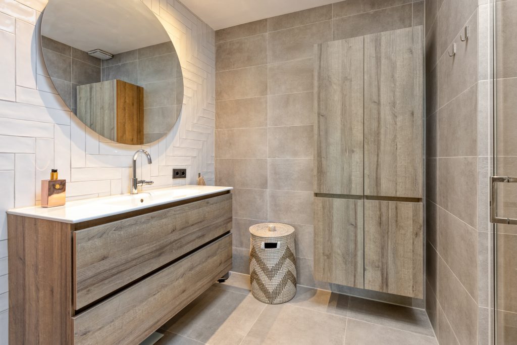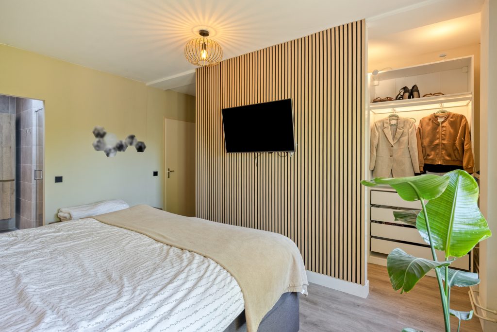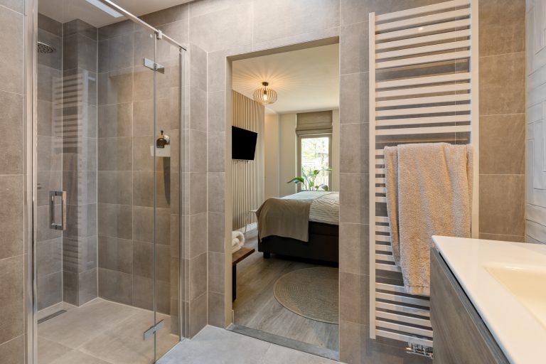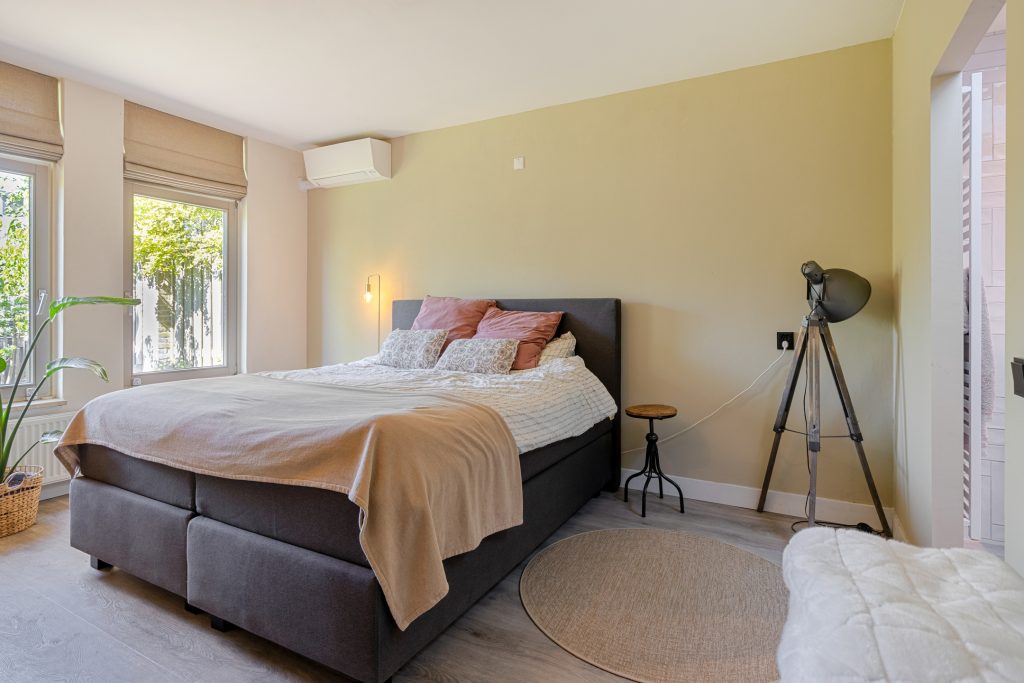 Wat deze woning extra aantrekkelijk maakt, is de levensloopbestendige indeling. Op de begane grond bevindt zich een ruime slaapkamer met uitzicht op de tuin, voorzien van airconditioning, een walk-in closet en een luxe ensuite badkamer (2025). Deze moderne badkamer is ingericht met een inloopdouche, wastafelmeubel, designradiator, vloerverwarming en een lichtkoepel die zorgt voor aangenaam daglicht.