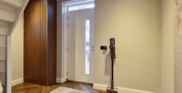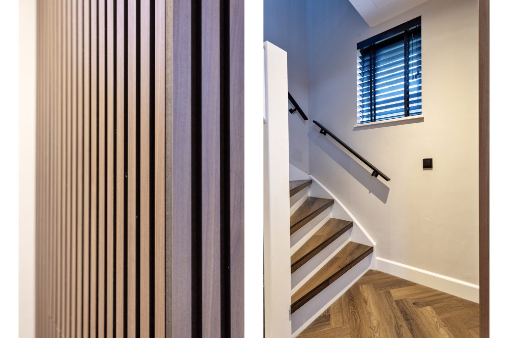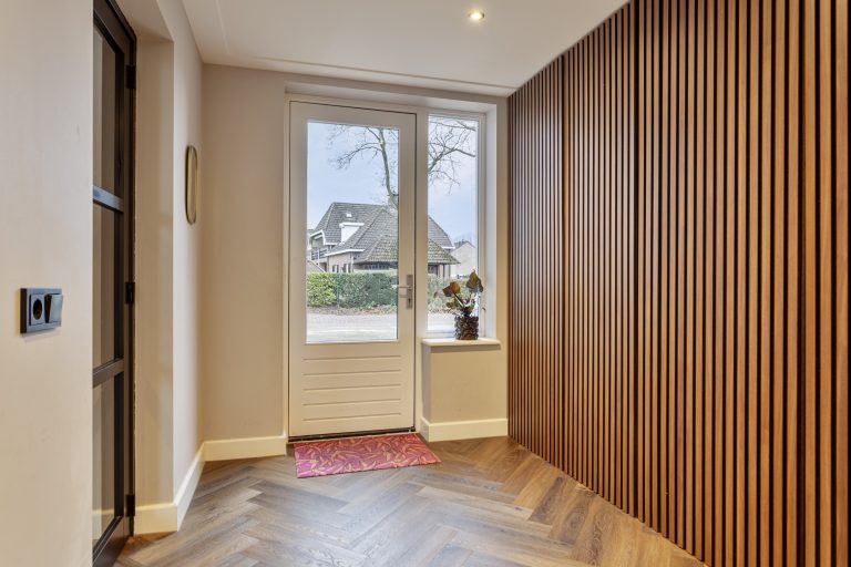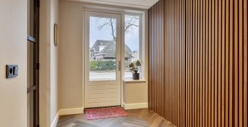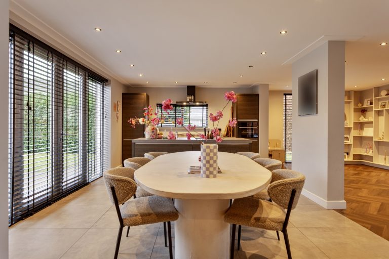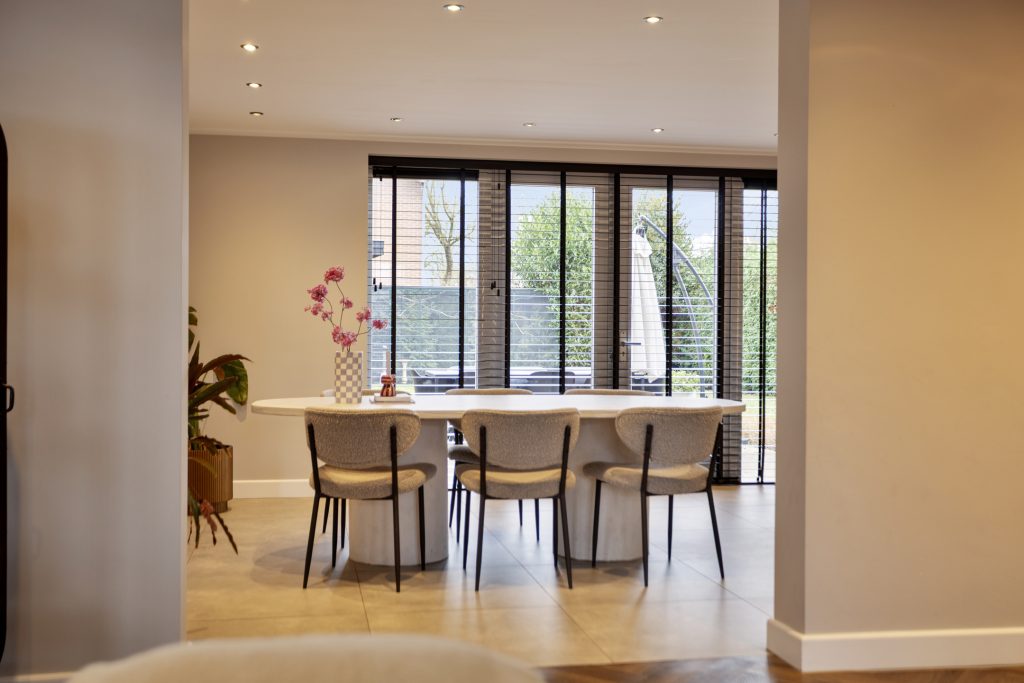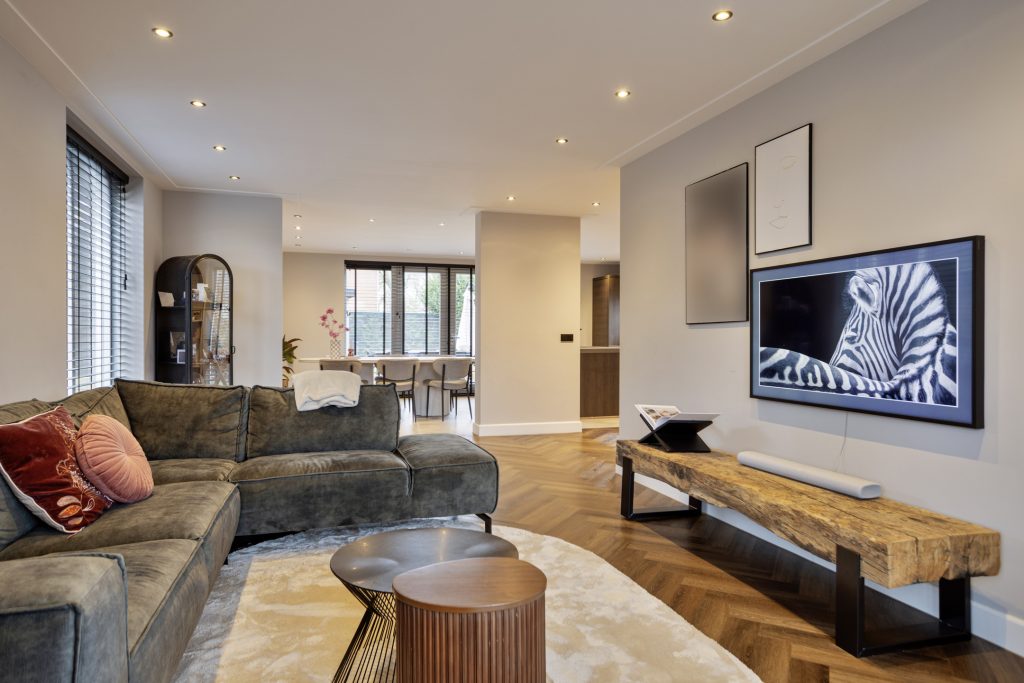 Via de ruime hal met meterkast en trapopgang kom je in de royale woonkamer. Deze sfeervolle leefruimte is stijlvol afgewerkt met een strakke PVC-visgraatvloer en biedt volop ruimte voor een comfortabele zithoek en een grote eettafel. De woonkamer loopt naadloos over in de eetkamer en de royale leefkeuken, wat zorgt voor een prettige en samenhangende leefruimte.