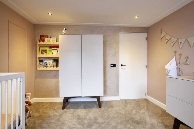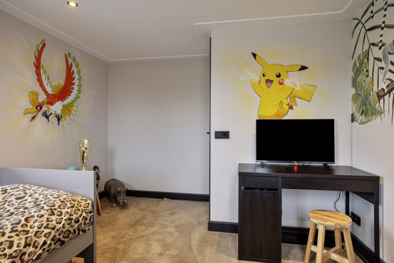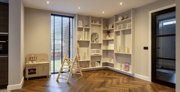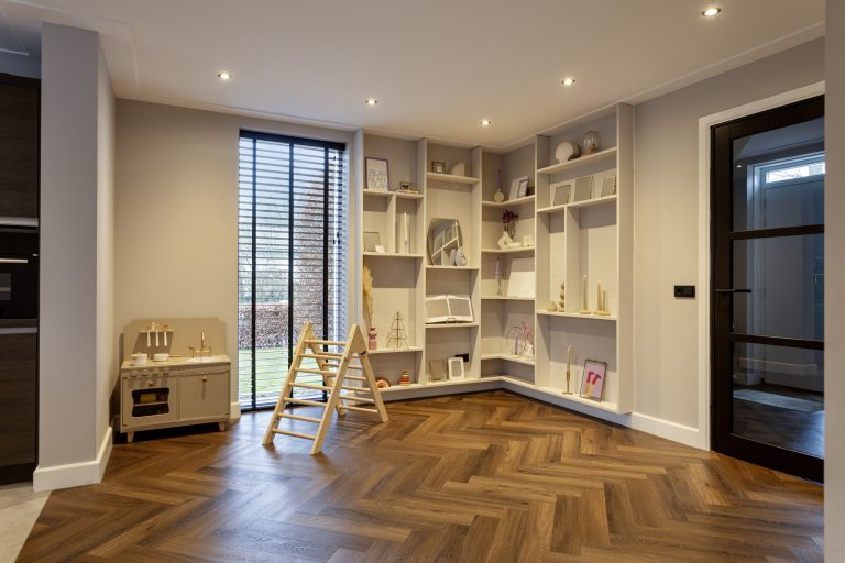 Vanuit de keuken is de bijkeuken bereikbaar, waar zich de witgoedaansluitingen, de cv-opstelling en de toiletruimte met zwevend toilet en fonteintje bevinden. Tevens is hier toegang tot een extra kamer, momenteel ingericht als speelkamer, maar ook uitstekend geschikt als slaapkamer, kantoor of werkruimte. De gehele begane grond is strak afgewerkt met gestuukte wanden en plafonds met sierlijsten en inbouwspots en is volledig voorzien van vloerverwarming.