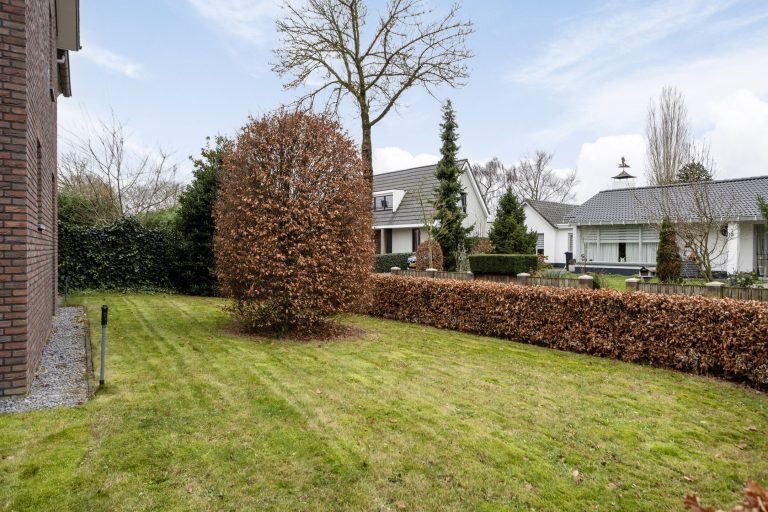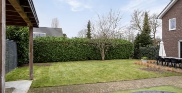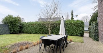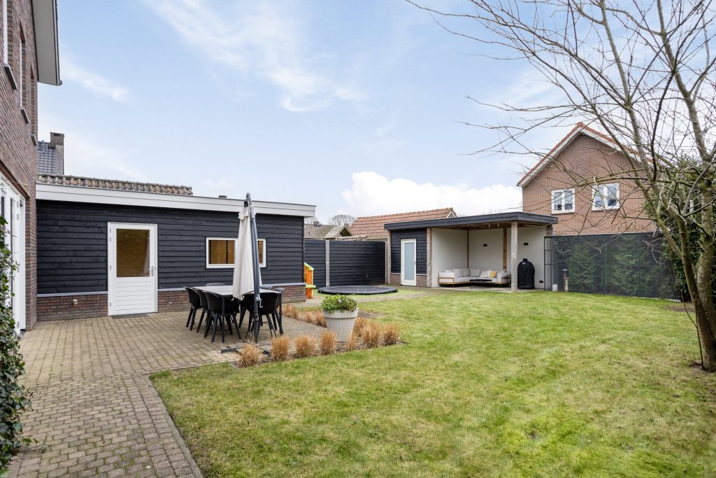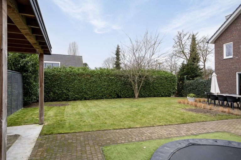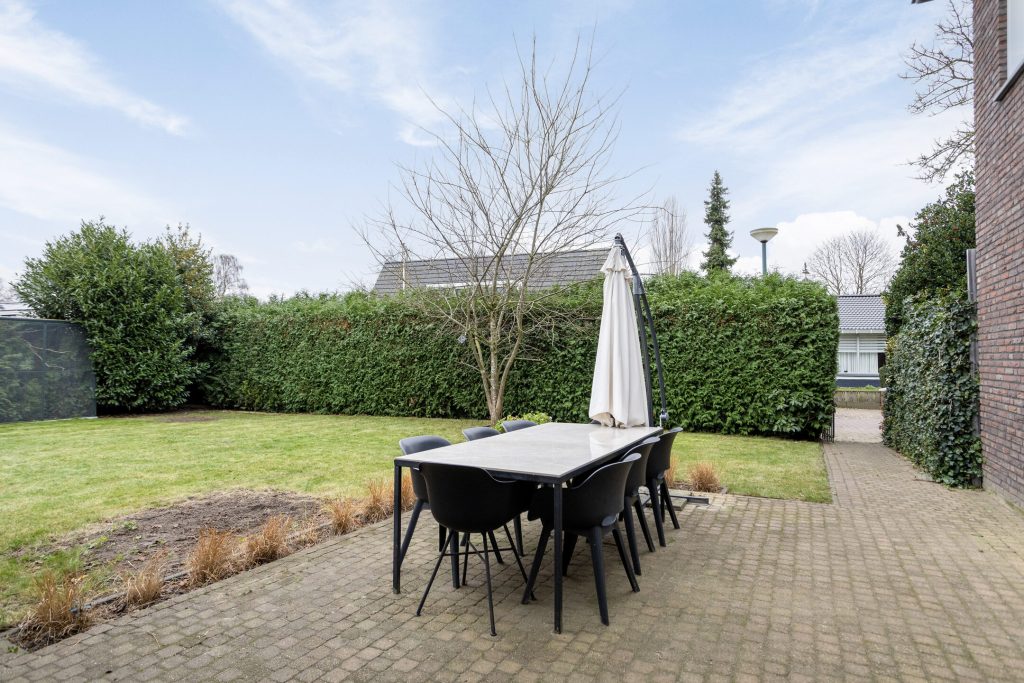 De woning beschikt over een voor-, zij- en achtertuin. De diepe achtertuin ligt op het zuiden en is verzorgd aangelegd met bestrating en gazon. Daarnaast is de tuin voorzien van een sproei-installatie. Achter in de tuin bevindt zich een berging met aangrenzende overkapping (2022), beide voorzien van elektra. De berging biedt ruimte voor fietsen en tuingereedschap en de overkapping creëert een mooie, comfortabele zitplek.