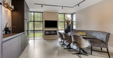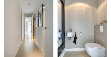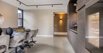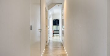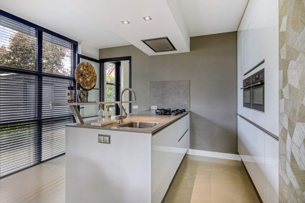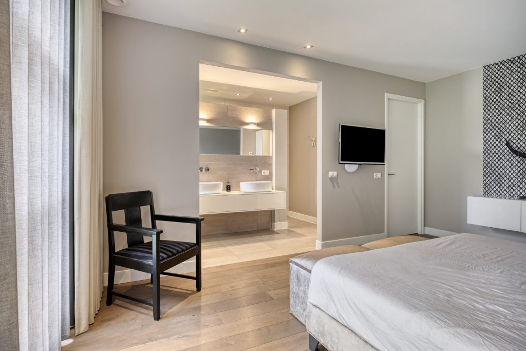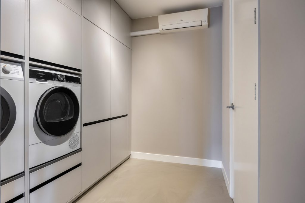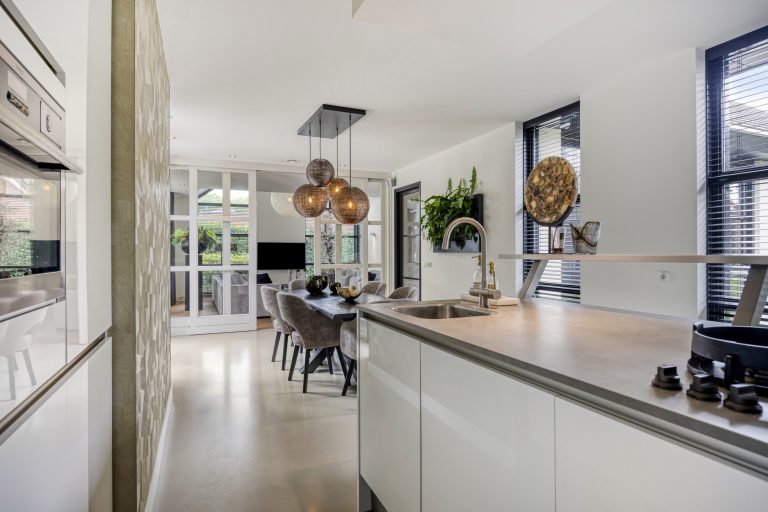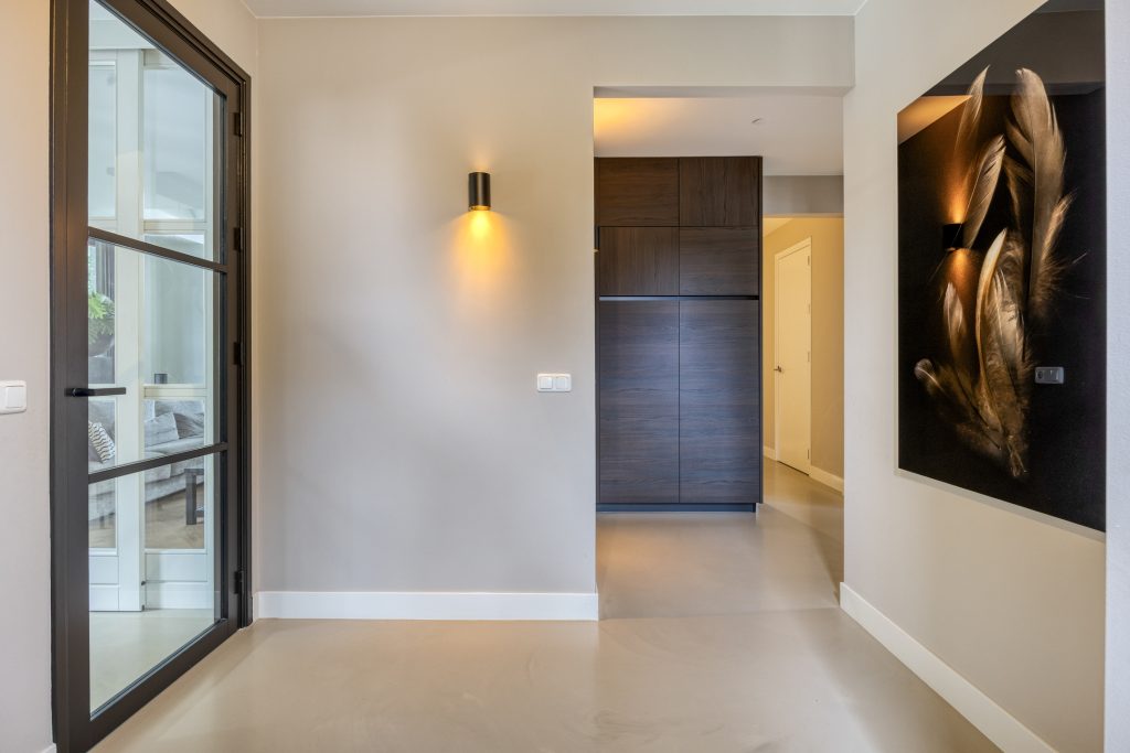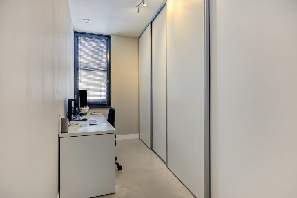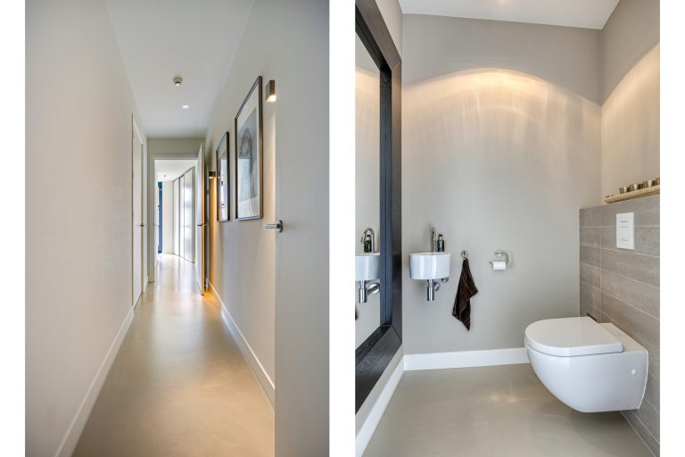 Aan de linkerzijde van de hal ligt een indrukwekkende leefkeuken, eveneens voorzien van een hoogwaardig keukenblok met onder andere een 5-pits gasfornuis, dubbele combimagnetron, koelkast en vriezer. Ensuite deuren leiden naar de royale woonkamer, die dankzij de grote raampartijen en het hoge plafond een zeer lichte en open uitstraling heeft. Via de gang vanuit de keuken bereikt u vervolgens de riante slaapkamer met massief houten vloer en strak stucwerk. De ensuite badkamer is stijlvol betegeld en beschikt over een inloopdouche, een wastafelmeubel met dubbele waskom, een zwevend toilet en uiteraard comfortabele vloerverwarming.