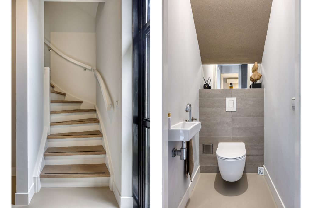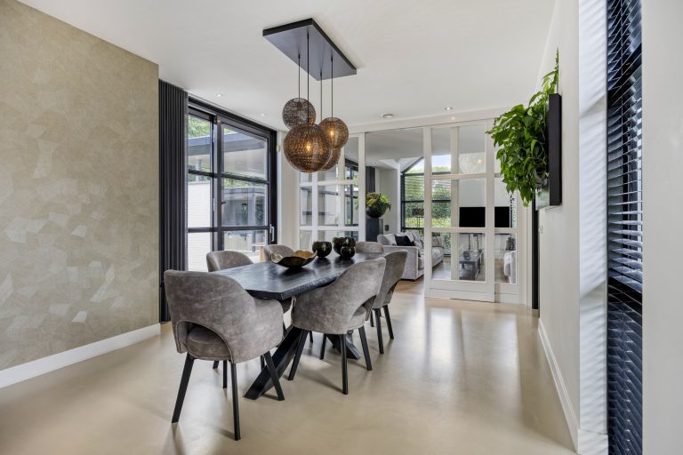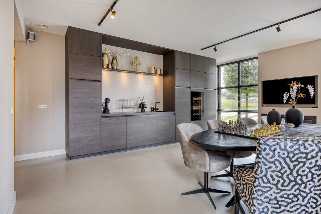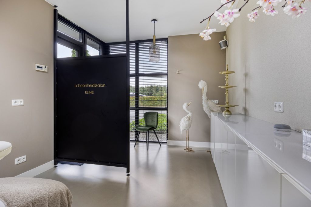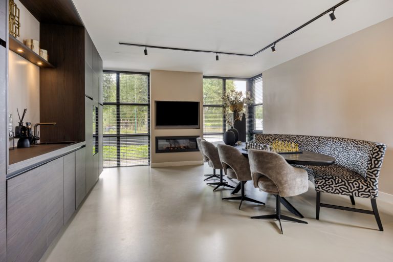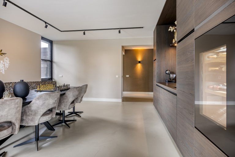 Bij binnenkomst in de hal valt direct het oog op de verzorgde afwerking en de ruimtelijke opzet. Hier bevinden zich de meterkast, garderobe en de trapopgang. Aan de rechterzijde betreedt u het eerste gedeelte van de woning: een royaal zitgedeelte met een luxe keukenblok, uitgerust met hoogwaardige inbouwapparatuur, waaronder een stijlvolle wijnklimaatkast. De ruimte ademt sfeer, mede dankzij de elektrische haard. Aangrenzend is er een praktische wasruimte met aansluitingen voor witgoed, en een ruime extra kamer met eigen entree en wastafel; ideaal voor praktijk aan huis of andere doeleinden.