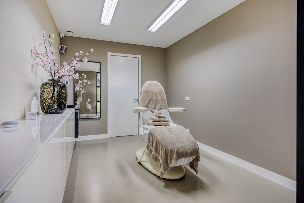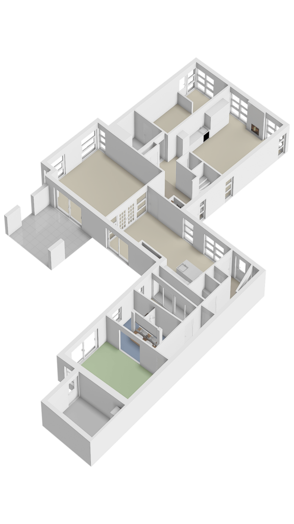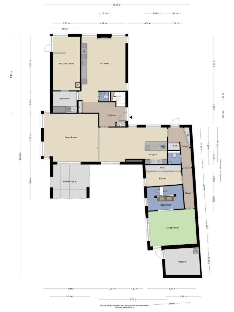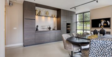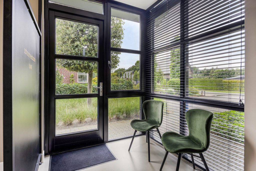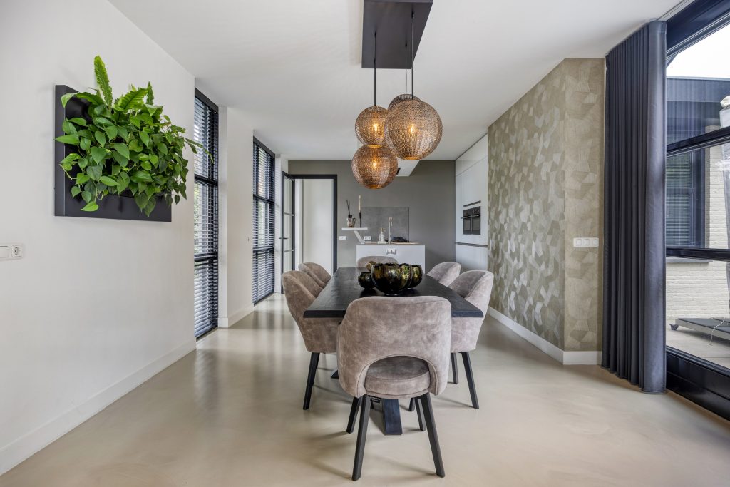 Bij binnenkomst in de hal valt direct het oog op de verzorgde afwerking en de ruimtelijke opzet. Hier bevinden zich de meterkast, garderobe en de trapopgang. Aan de rechterzijde betreedt u het eerste gedeelte van de woning: een royaal zitgedeelte met een luxe keukenblok, uitgerust met hoogwaardige inbouwapparatuur, waaronder een stijlvolle wijnklimaatkast. De ruimte ademt sfeer, mede dankzij de elektrische haard. Aangrenzend is er een praktische wasruimte met aansluitingen voor witgoed, en een ruime extra kamer met eigen entree en wastafel; ideaal voor praktijk aan huis of andere doeleinden.