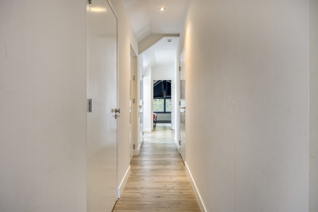 Op de eerste verdieping komt u op een ruim opgezette overloop. Hier bevinden zich twee goed afgewerkte slaapkamers met pvc-vloeren en strak gestucte wanden. De tweede badkamer is wederom luxe uitgevoerd met een ligbad, inloopdouche, dubbele wastafel en een zwevend toilet. Daarnaast treft u hier de technische ruimte.