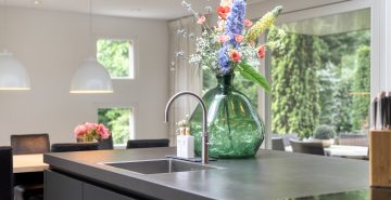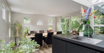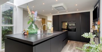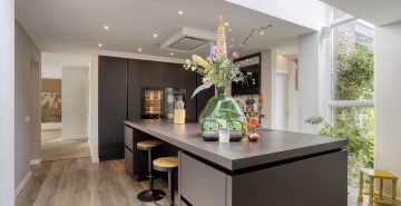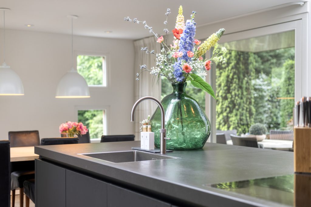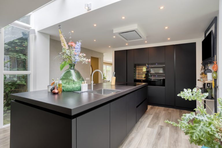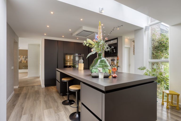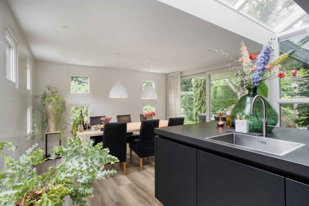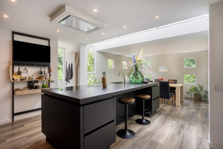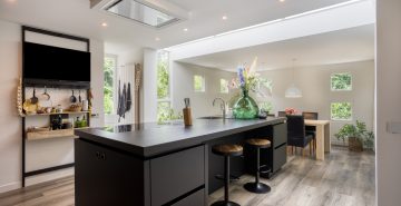 – Een riante leefkeuken met een prachtige lichtstraat en een schuifpui naar het terras