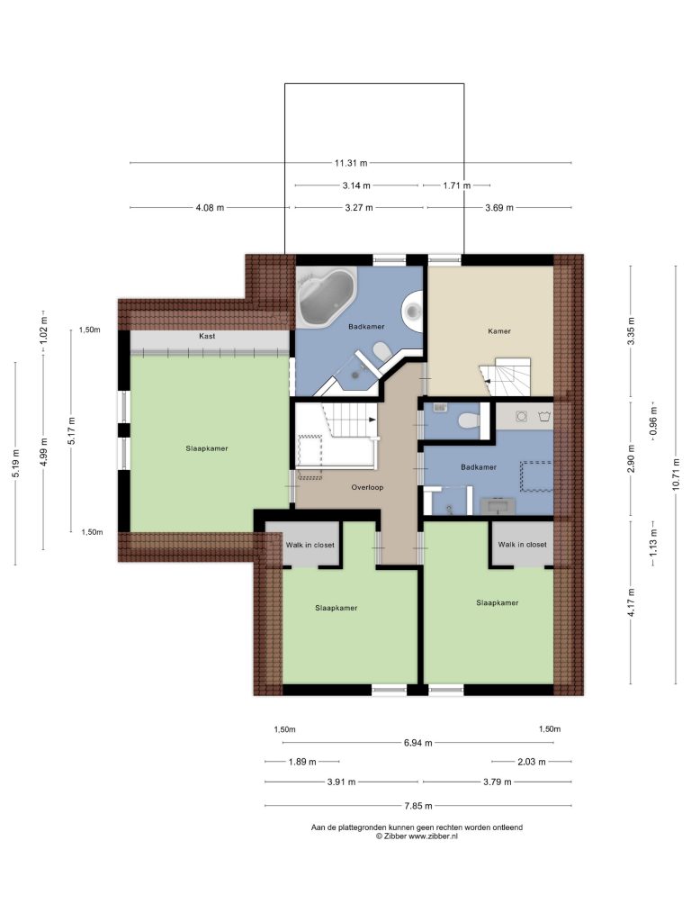 Op de eerste verdieping vind je vier ruime slaapkamers, waarvan twee met een walk-in-closet en één met een maatwerk kastenwand. De woning beschikt over twee volwaardige badkamers, waarvan één met ligbad, douche, toilet en wastafelmeubel, en een tweede met een inloopdouche en wastafelmeubel. Het separate toilet is bereikbaar via de overloop.