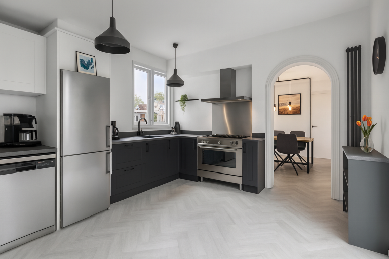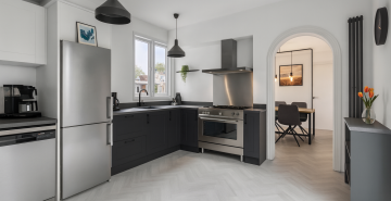 – Halfopen keuken met licht keukenmeubel en inbouwapparatuur