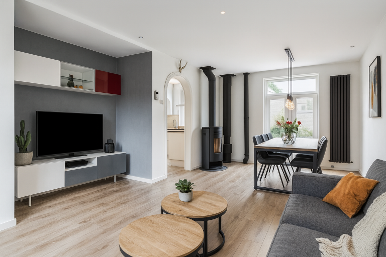 – Ruime woonkamer met sfeervolle houthaard en airconditioning