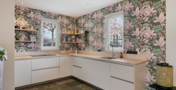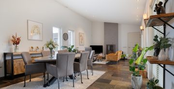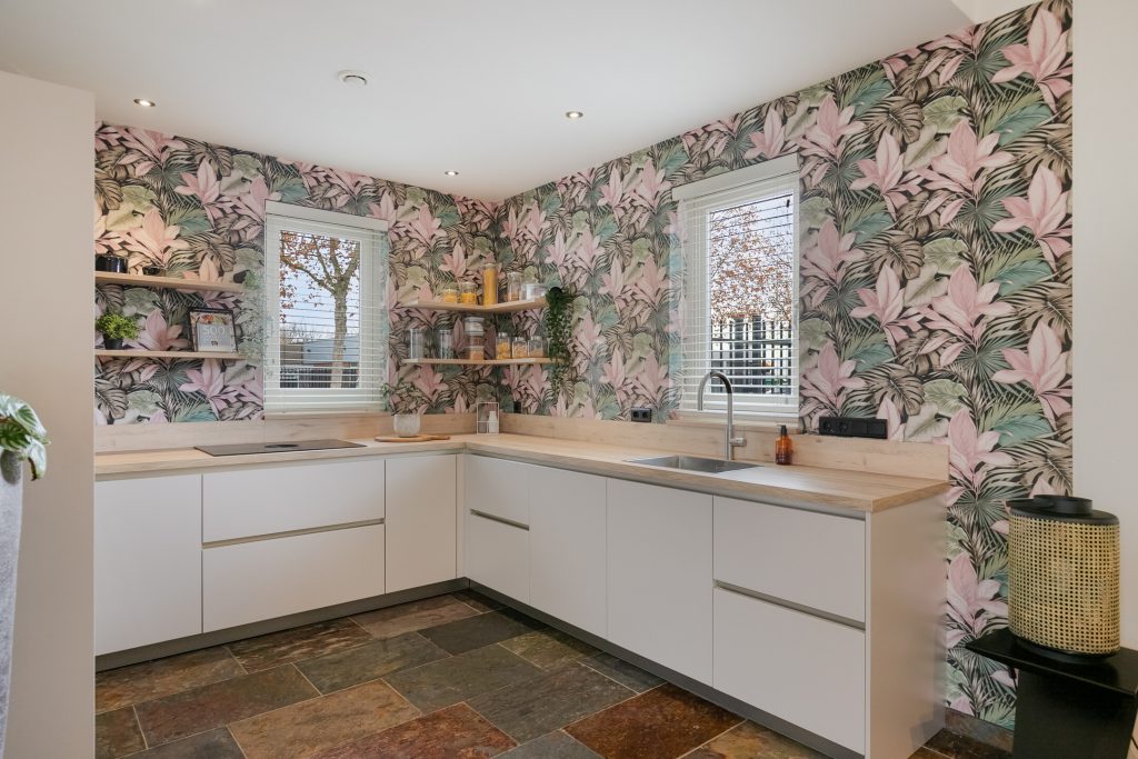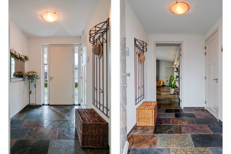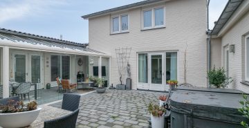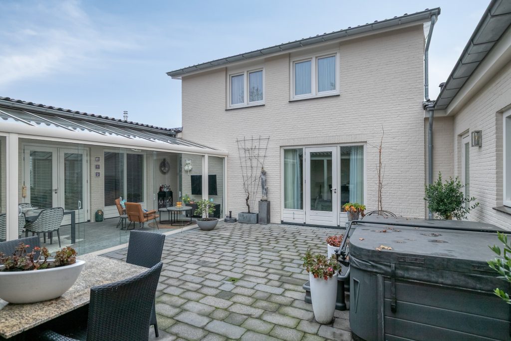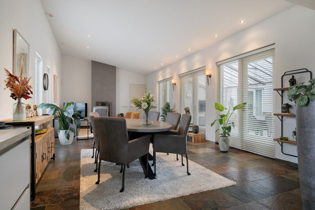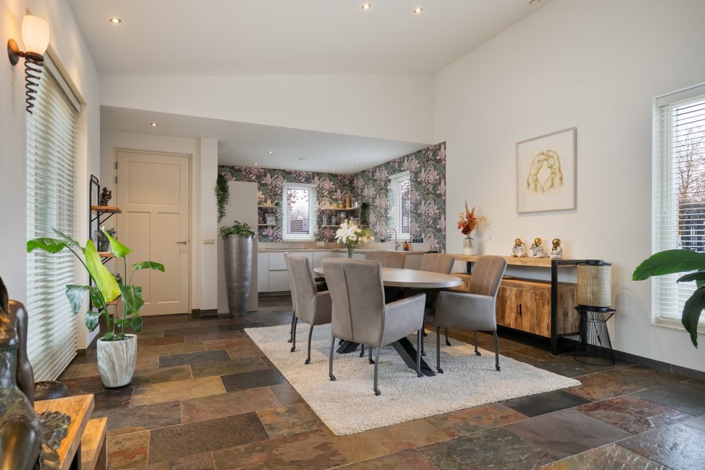 Bij binnenkomst in de woning valt direct de fijne sfeer op. Vanuit de entree met toiletruimte en garderobe loopt u door naar de royale woonkamer, waar een gashaard en openslaande deuren naar de serre zorgen voor een prettige, lichte leefruimte. De serre vormt een heerlijke plek om het hele jaar door te genieten van rust en het buitengevoel. De moderne open keuken uit 2023 is volledig ingericht met hoogwaardige apparatuur, waaronder een 4-pits inductiekookplaat met Bora-afzuiging, een stoomoven, combi-oven, grote koelkast, vaatwasmachine en Quooker; een keuken die zowel voor dagelijks koken als voor uitgebreide diners perfect is uitgerust. Aansluitend bevindt zich de praktische bijkeuken met extra keukenblok en grote vriezer.