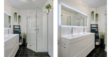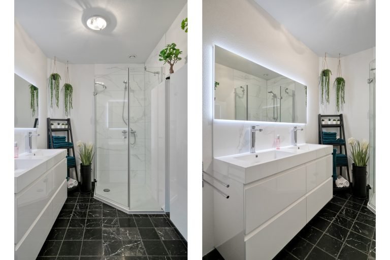 – Badkamer met douchecabine, dubbele wastafel met badmeubel