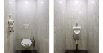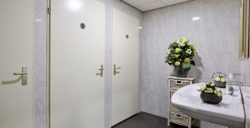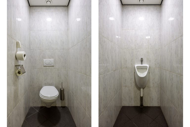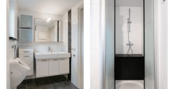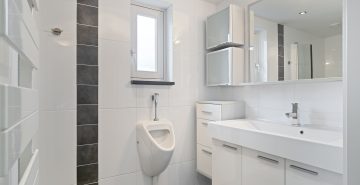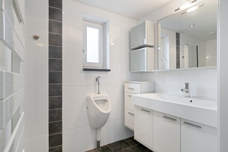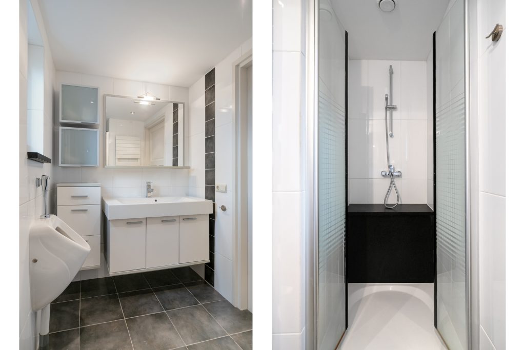 – Badkamer met douchecabine, wastafel met badmeubel en urinoir