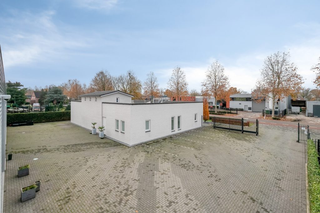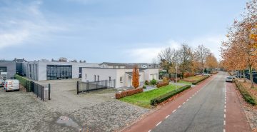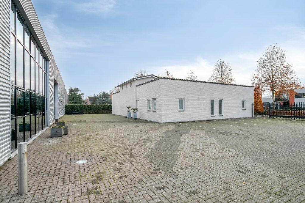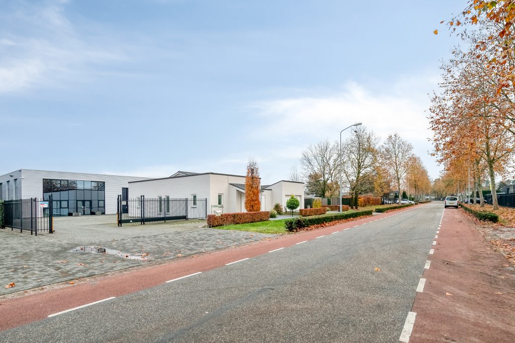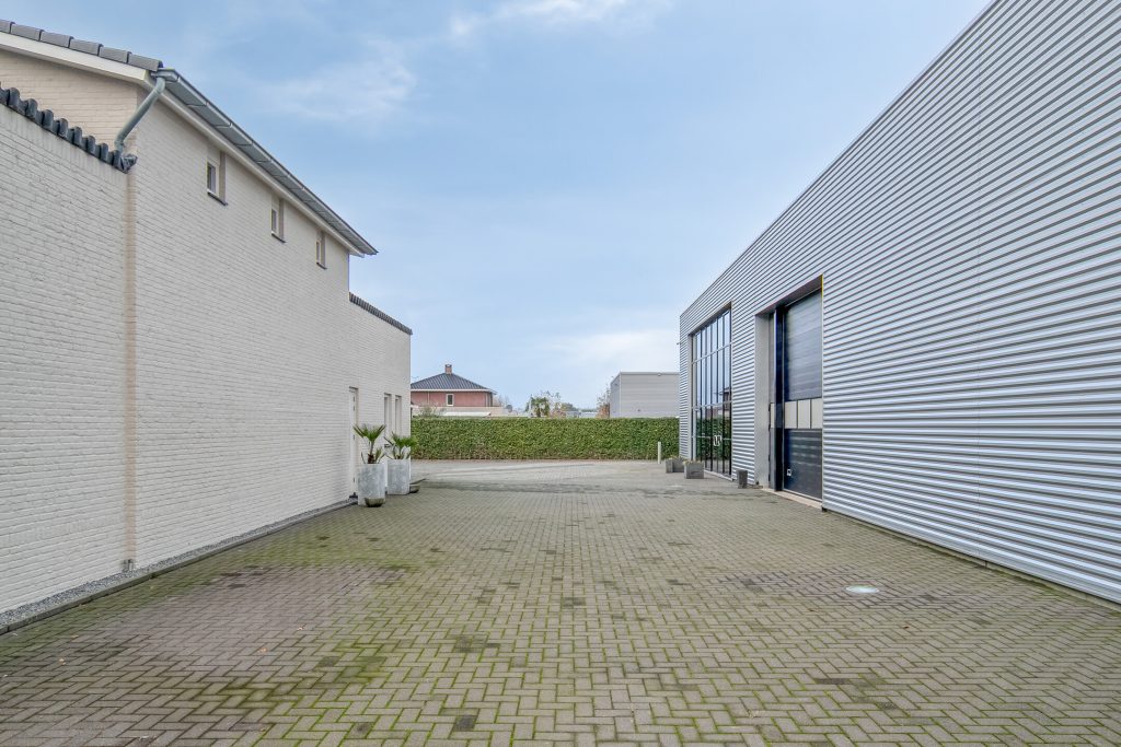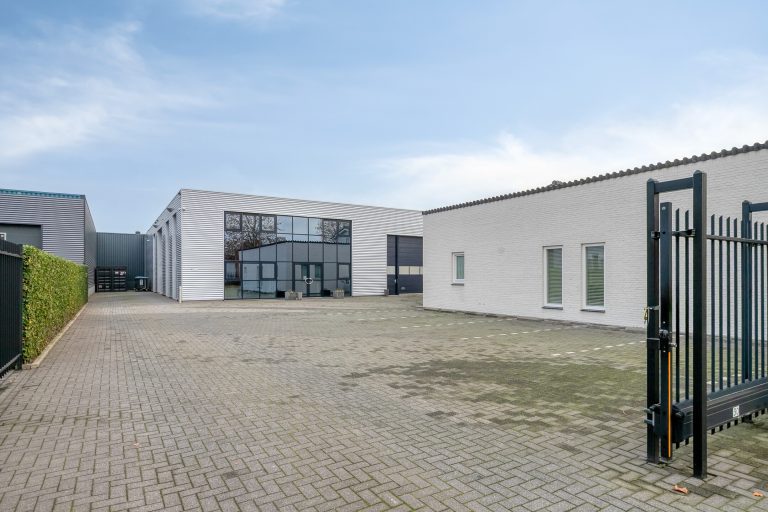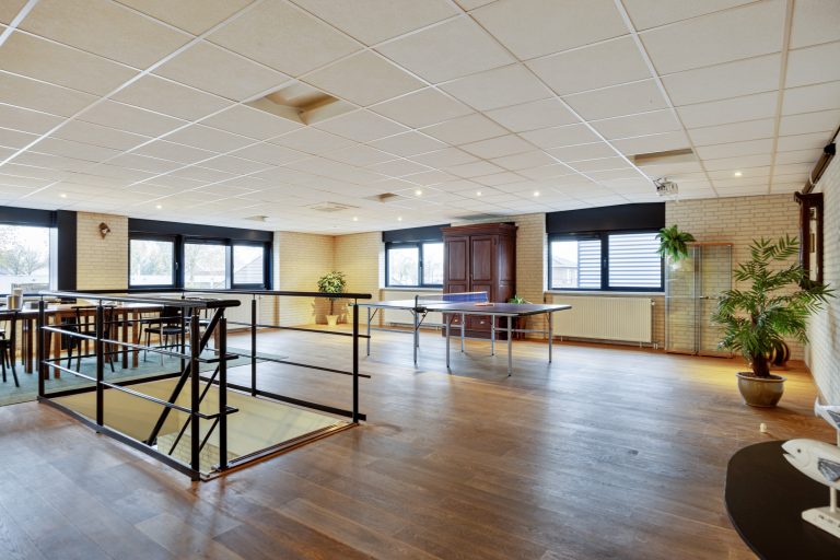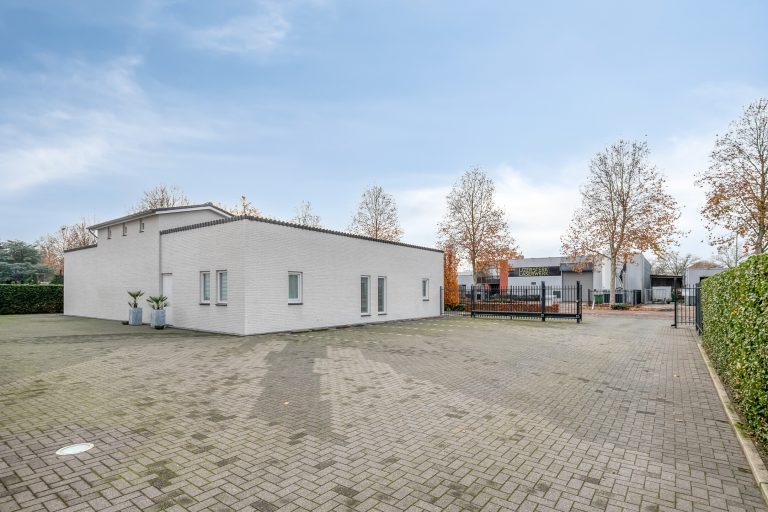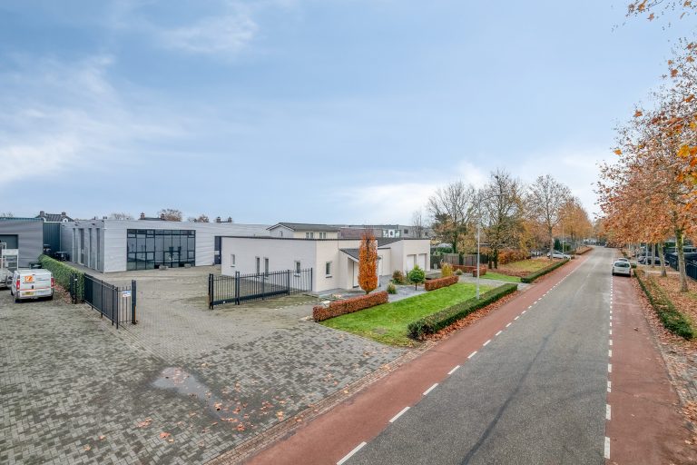 Achter de woning ligt de representatieve bedrijfsruimte, ideaal voor ondernemers die behoefte hebben aan zowel kantoor- als opslag- of productieruimte. De afmetingen zijn in totaal circa 32,5 x 29,60 m met een totaaloppervlakte van 1800 m². De entree is voorzien van een toiletruimte en trapopgang, en aansluitend bevinden zich drie royale kantoorruimtes en een bedrijfshal van circa zes meter hoog, uitgerust met een goederenlift en twee overheaddeuren. Op de eerste verdieping bevindt zich een kantine met eigen keukenmeubel en toilet, evenals een riante entresolvloer van circa 750 m² die uitstekend kan dienen als extra opslag- of werkruimte. De bedrijfsruimte is ingedeeld in 210 m² kantoorruimte en circa 850 m² bedrijfshal op de begane grond en circa 750 m² op de entresolvloer. Voor de bedrijfsruimte zijn negen parkeerplaatsen beschikbaar op eigen terrein.