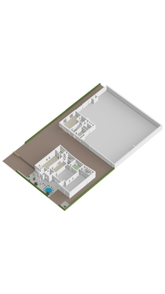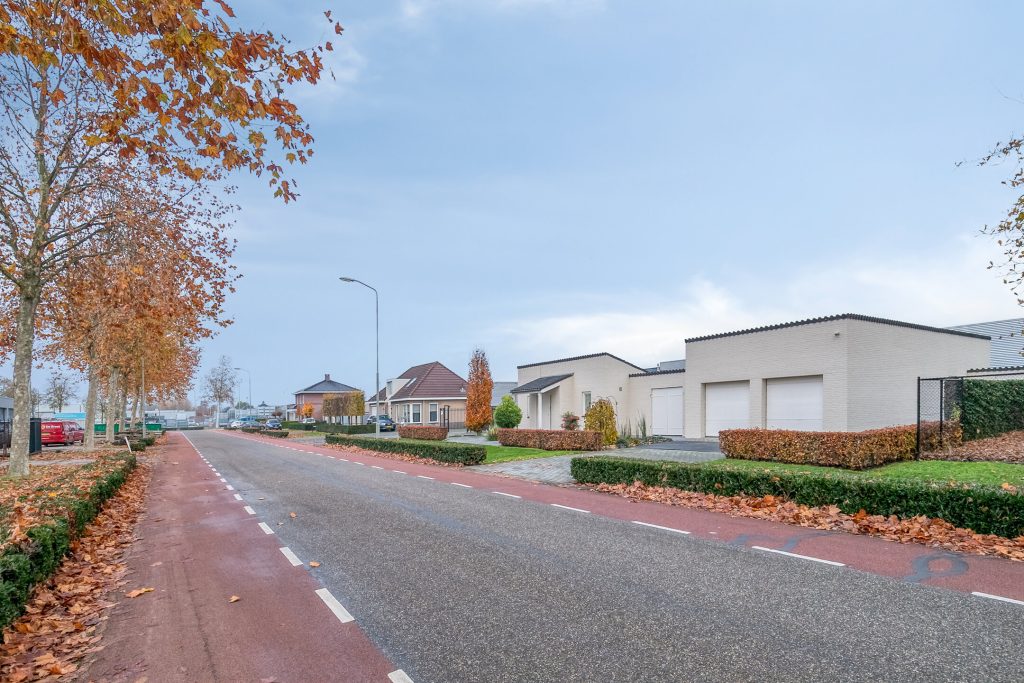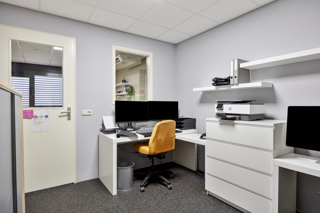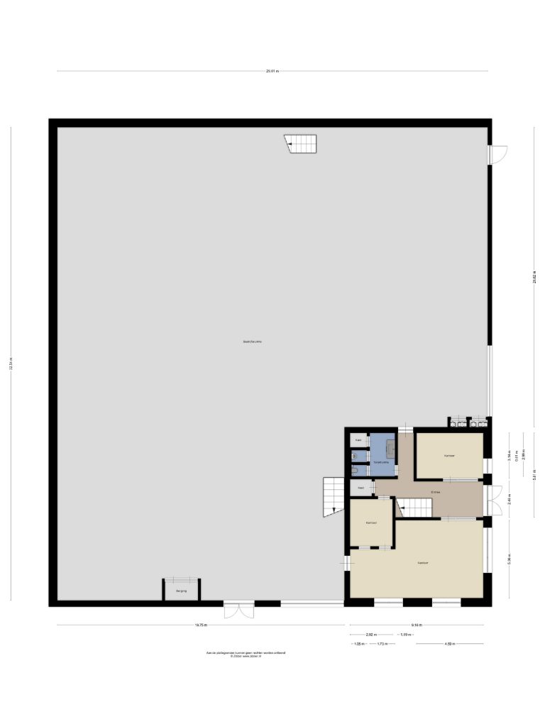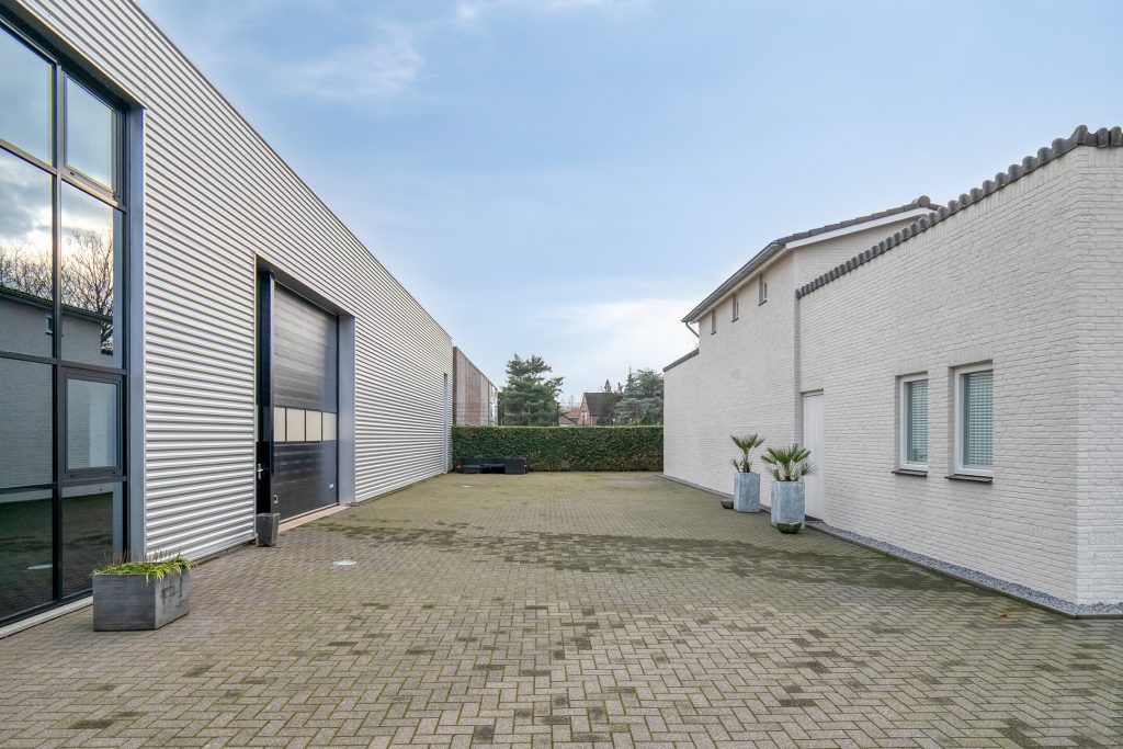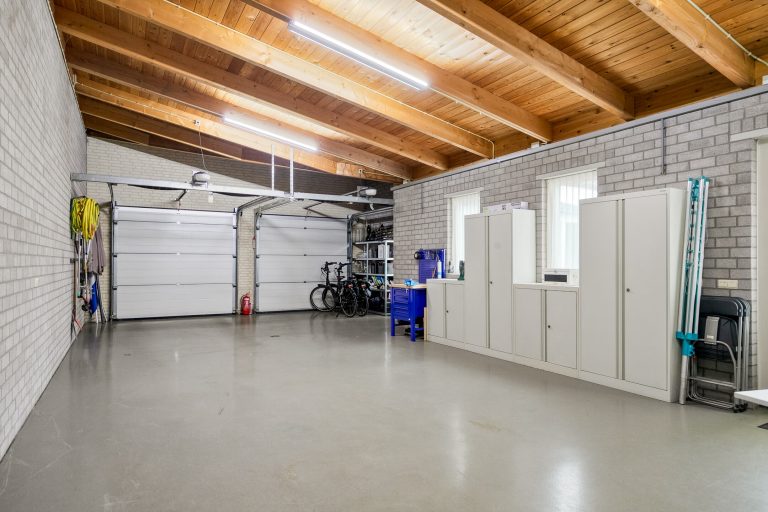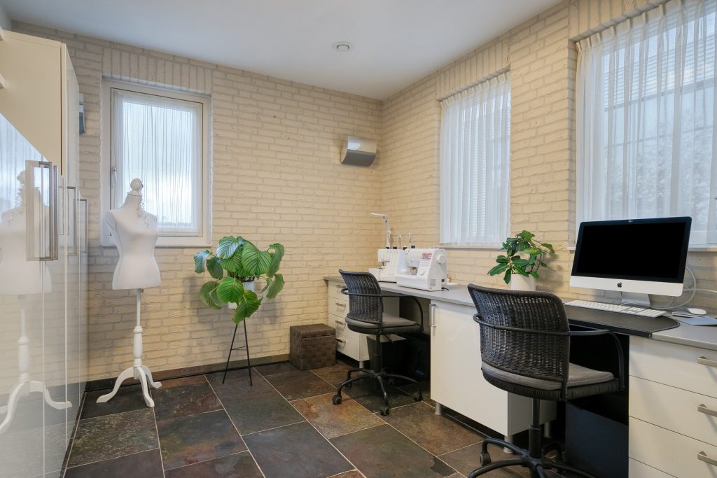 Achter de woning ligt de representatieve bedrijfsruimte, ideaal voor ondernemers die behoefte hebben aan zowel kantoor- als opslag- of productieruimte. De afmetingen zijn in totaal circa 32,5 x 29,60 m met een totaaloppervlakte van 1800 m². De entree is voorzien van een toiletruimte en trapopgang, en aansluitend bevinden zich drie royale kantoorruimtes en een bedrijfshal van circa zes meter hoog, uitgerust met een goederenlift en twee overheaddeuren. Op de eerste verdieping bevindt zich een kantine met eigen keukenmeubel en toilet, evenals een riante entresolvloer van circa 750 m² die uitstekend kan dienen als extra opslag- of werkruimte. De bedrijfsruimte is ingedeeld in 210 m² kantoorruimte en circa 850 m² bedrijfshal op de begane grond en circa 750 m² op de entresolvloer. Voor de bedrijfsruimte zijn negen parkeerplaatsen beschikbaar op eigen terrein.