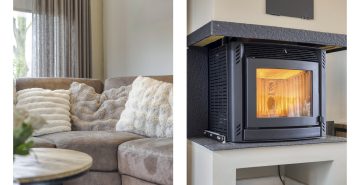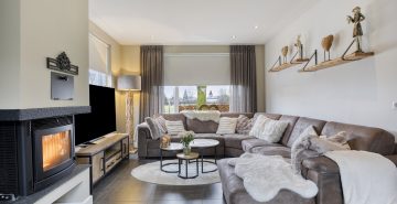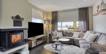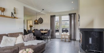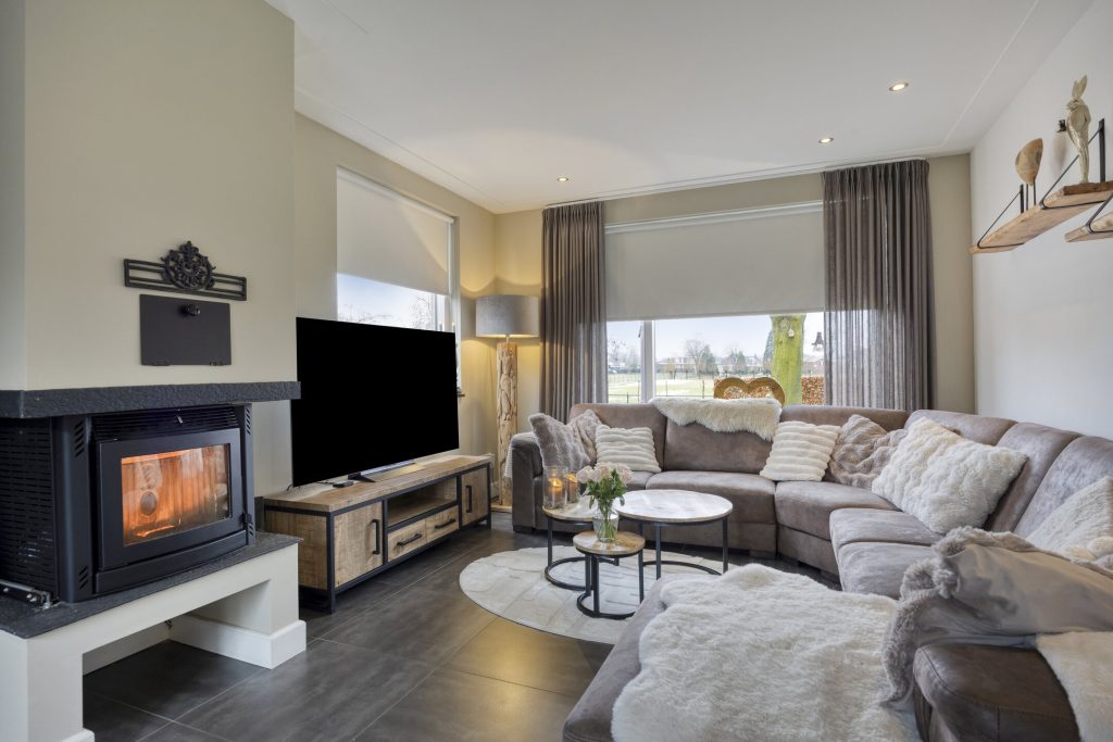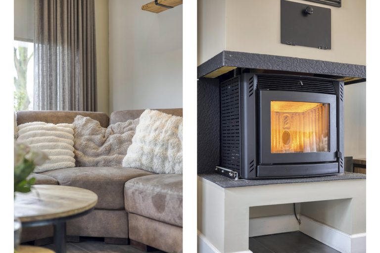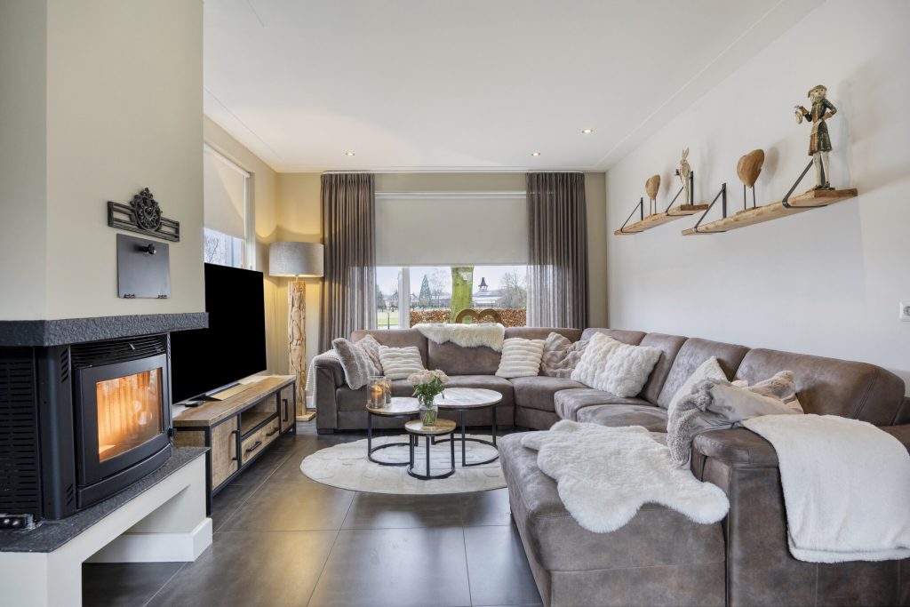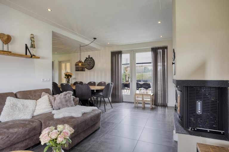 – Woonkamer met houthaard en openslaande tuindeuren
