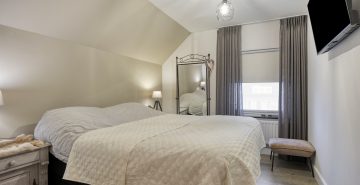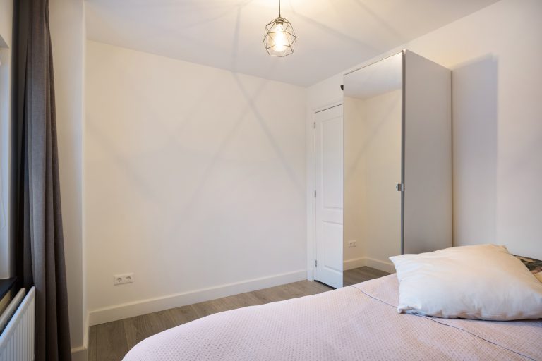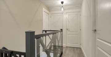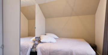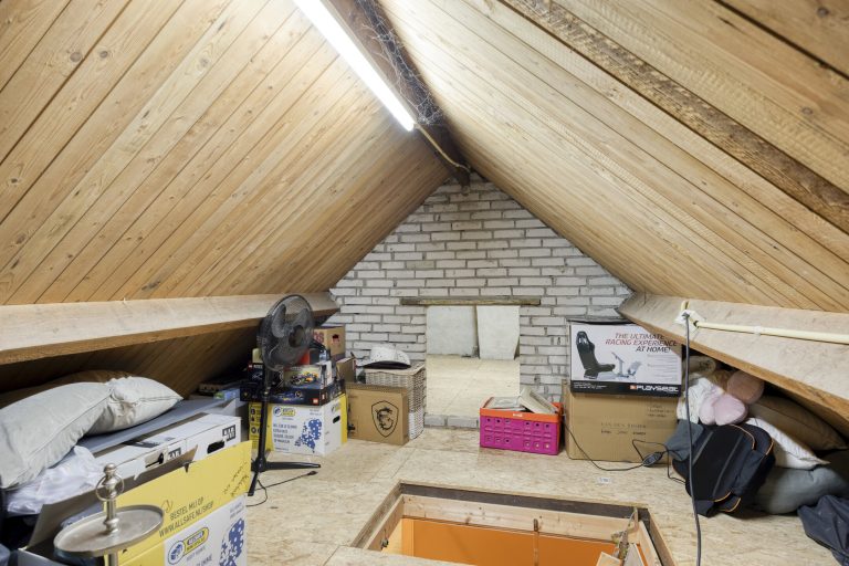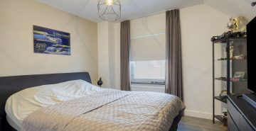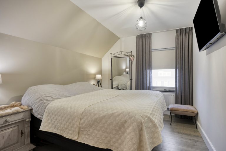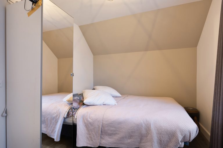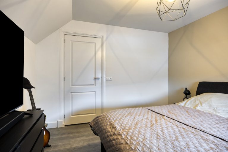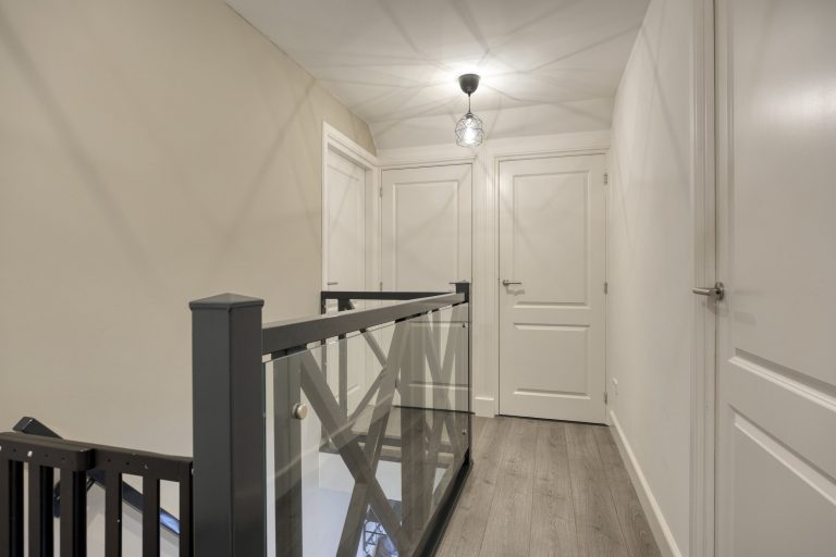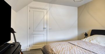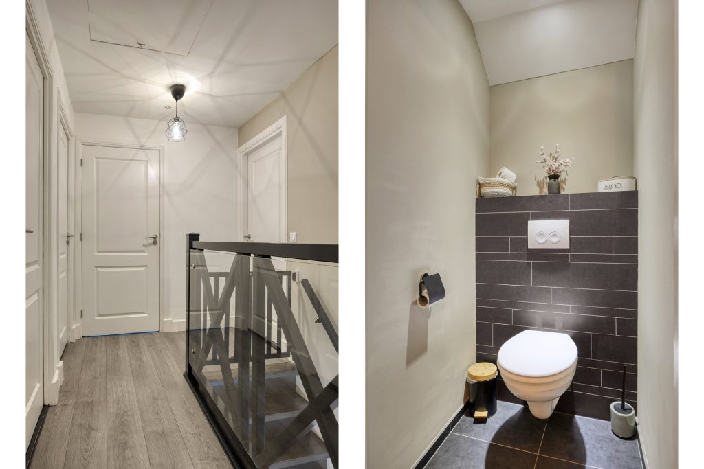 Op de eerste verdieping geeft de overloop toegang tot drie ruime slaapkamers, de badkamer en een separate toiletruimte. Alle slaapkamers zijn keurig afgewerkt met een laminaatvloer en strak stucwerk. Eén slaapkamer beschikt over een inloopkast; de overige slaapkamers maken gebruik van de vaste kasten op de overloop. De volledig betegelde badkamer is voorzien van vloerverwarming en ingericht met een inloopdouche met hand- en regendouche, ligbad en een dubbele wastafel met meubel. Het separate toilet is uitgerust met een zwevend toilet. Via een vlizotrap is de praktische bergzolder bereikbaar.
